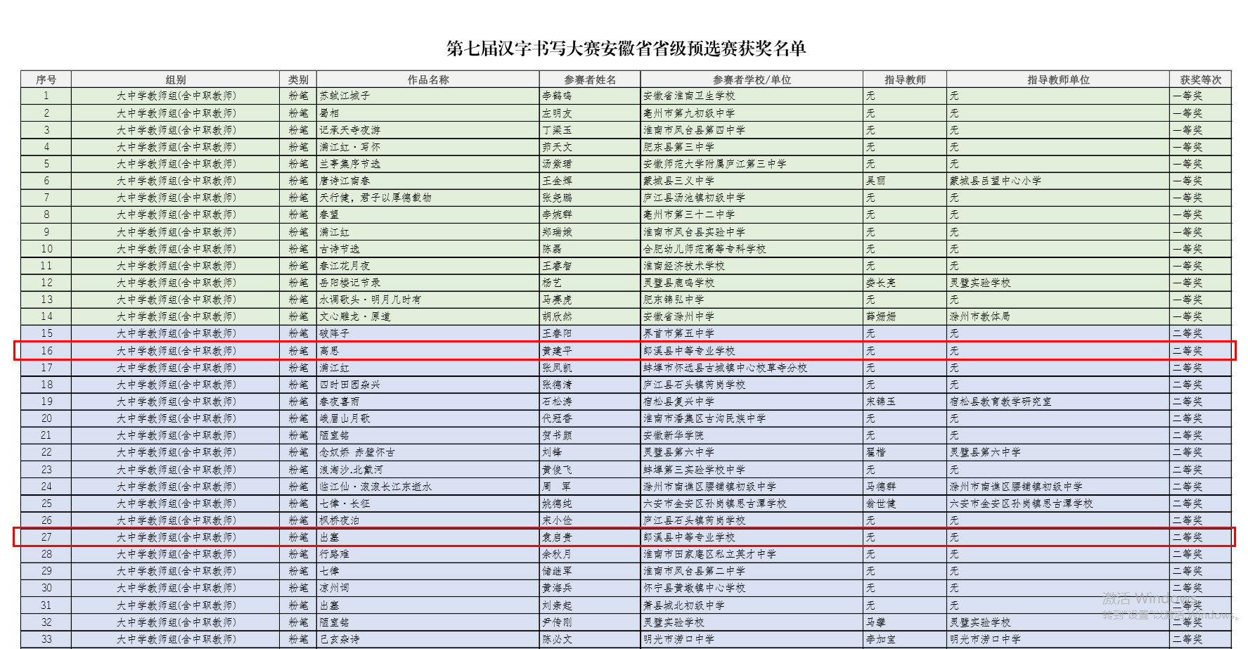 我校两名教师获汉字书写大赛省二等奖 近期,安徽省教育厅官网公示了第七届中华经典诵写讲”笔墨中国“汉字书写大赛安徽省预选赛获奖名单,郎溪县中等专业学校教师黄建平、袁启贵在比赛中表现突出,均荣获大中学教师